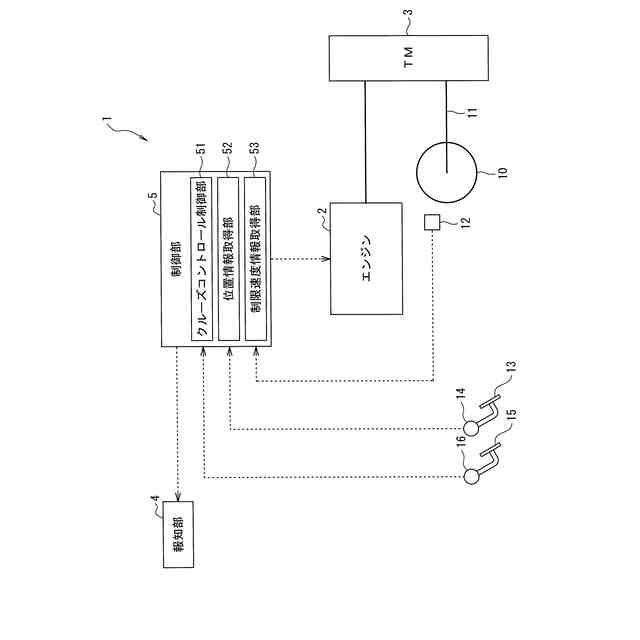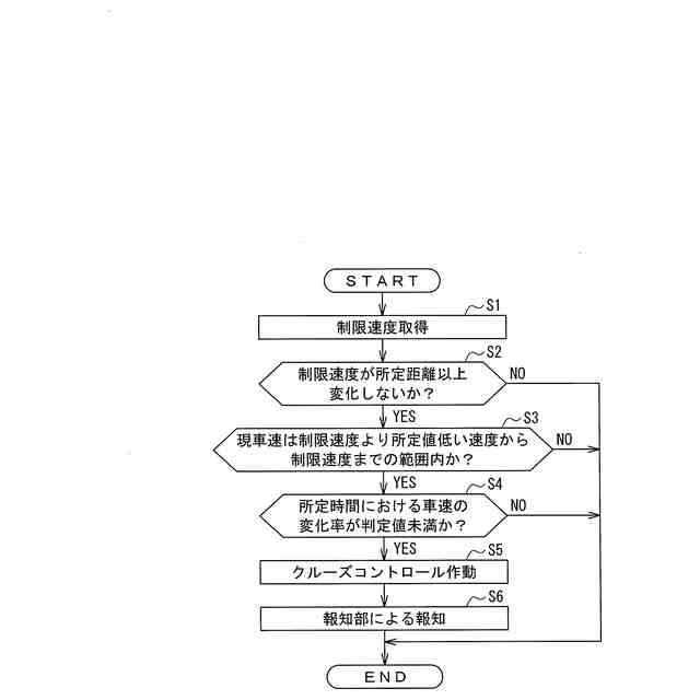 【解決手段】各種情報をドライバーに報知する報知部4と、ドライバーによって操作されるアクセルペダル13の開度であるアクセル開度を検出するアクセル開度センサ14と、ドライバーによるアクセル操作が検出されており、所定時間における車速の変化率が判定値未満であると判定したときに、その時の車速を設定車速として自動的にクルーズコントロール機能を作動させる制御部5と、を備える。