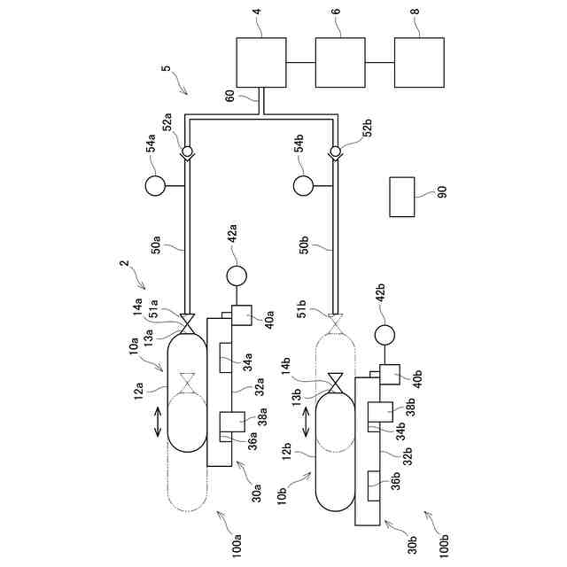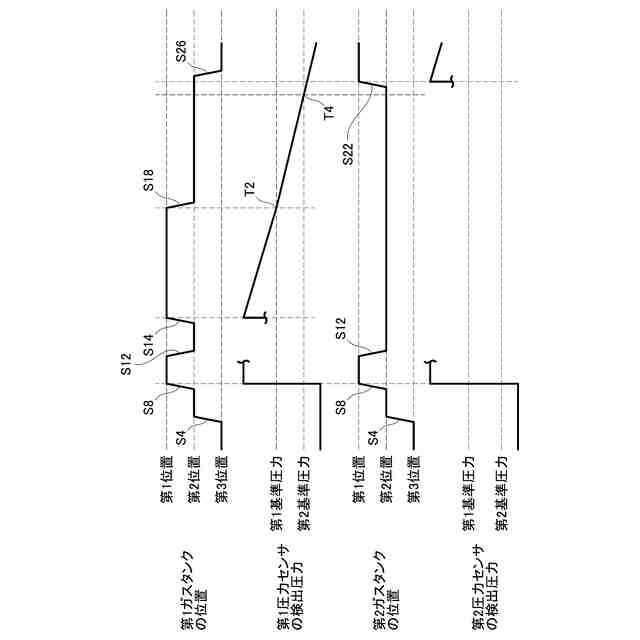 第4の態様では、上記第1から第3の態様のいずれか一つにおいて、複数の前記ガスタンクのうちの1つである第2ガスタンクは、複数の前記ガス供給管のうちの1つである第2ガス供給管を通じて前記ガス消費装置にガスを供給可能であってもよい。前記第2ガスタンクは、前記ガス消費装置に供給するガスを高圧の状態で貯留する第2タンク本体と、前記第2タンク本体のガス供給口を開閉する第2開閉弁であって前記第2ガス供給管に接続される前記第2開閉弁と、を備えていてもよい。前記第2ガスタンクは、前記第2開閉弁が前記第2ガス供給管に接続されている状態で前記第2開閉弁が開弁することにより前記第2タンク本体内のガスが前記第2ガス供給管を通じて前記ガス消費装置に供給される第1状態に遷移可能であってもよい。前記方法は、前記第2ステップの後に前記第1ガス供給管内のガスが前記ガス消費装置により消費されることにより前記第1ガス供給管内のガスの圧力が前記基準圧力未満に低下した後に、前記第2ガスタンクを前記第1状態にする第4ステップを更に備えていてもよい。
