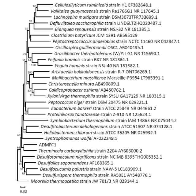 ADMFC1株とユーバクテリアレス(Eubacteriales)目に属する各科のタイプ株との分子系統関係を示す系統樹である。