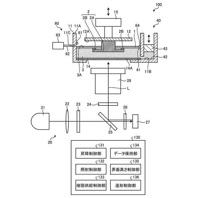 【解決手段】光造形装置100を制御する制御装置130であって、プラットホーム12を界面3Aに対して上昇させつつ、光Lの照射により硬化層を順次下方に積層させた第1造形物2Aを造形するステップと、プラットホーム12を界面3Aに対して下降させて第1造形物2Aの少なくとも一部を、離型材料3に沈下させた後、プラットホーム12を界面3Aに対してさらに下降させつつ、光Lの照射により第1造形物2Aの最下面よりも高い位置に硬化層を順次上方に積層させた第2造形物2Bを一体に造形するステップと、を実行する造形制御部136を備えた。