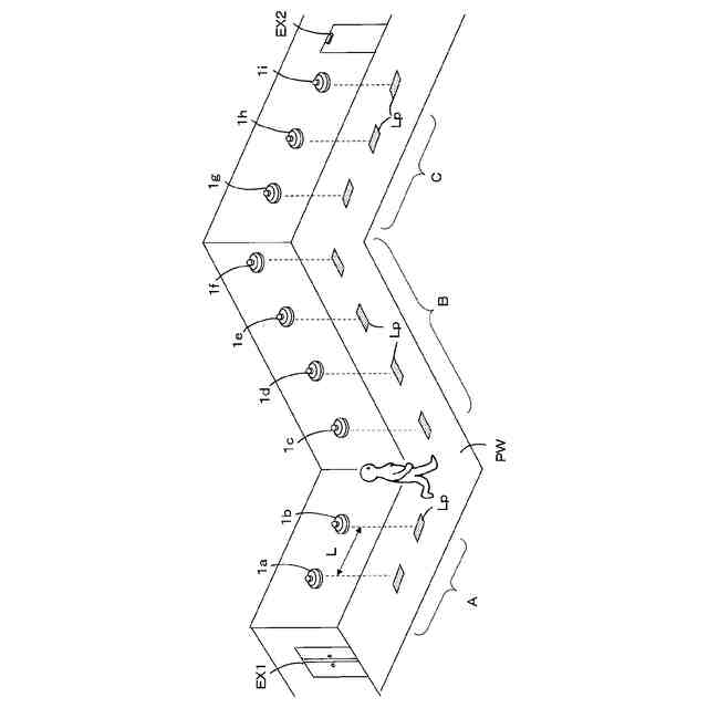 本発明の誘導装置を施設の避難用通路に配設した実施形態の模式図。