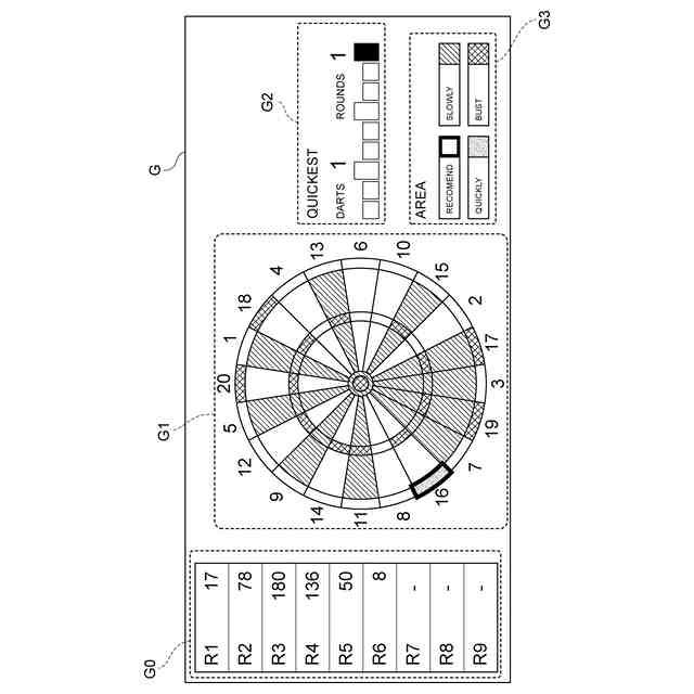 ゼロワン等のダーツゲームでは、予め設定された持ち点から、ダーツが当たったセグメントの得点を順次差し引いていき、持ち点をゼロ等の基準値に一致させることに成功すると上がりとなる。そのため、なるべく少ない投擲本数で上がるために次の投擲で当てるべきセグメントは、必ずしも得点が高いセグメントには限られず、持ち点に応じて様々なバリエーションが考えられる。しかしながら、次の投擲で当てるべきセグメントのバリエーションは、持ち点や戦略に応じて実に多様であり、その把握にはプレイヤにおける高度な習熟が必要とされていた。