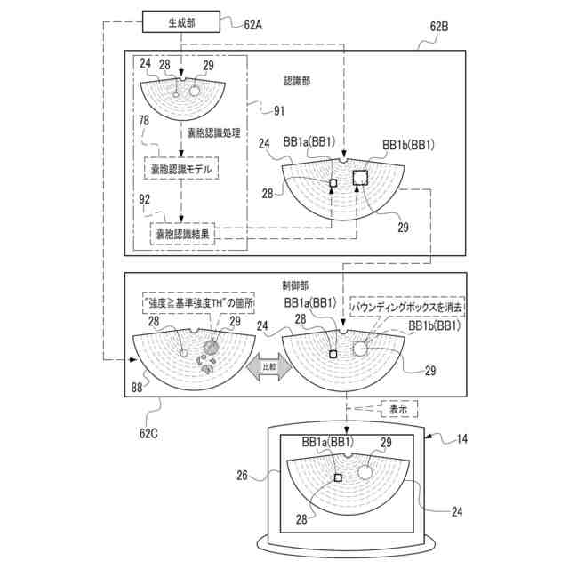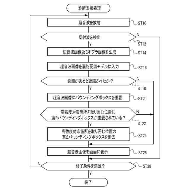 前記超音波診断において前記Bモード法と併用されるドプラ法で得られた血流分布情報に基づいて前記第1認識結果が変更された第2認識結果を出力する