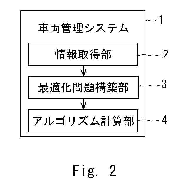 【解決手段】車両管理システムは、共用車両を保管する車両保管場所の位置、共用車両が車両保管場所間を移動する際の移動コスト、共用車両を利用するユーザの出発地及び目的地、ユーザが車両保管場所へ移動するための移動コストの情報を取得する情報取得手段と、情報取得手段により取得された情報に基づいて第1最適化問題を構築し、構築した第1最適化問題において、不等式制約を等式制約に変換し式の変数を連続緩和した第2最適化問題を構築する最適化問題構築手段と、最適化問題構築手段により構築された第2最適化問題に基づいてラグランジュ乗数を算出し、算出したラグランジュ乗数に基づいて第2最適化問題の解を算出するアルゴリズム計算手段と、を備える。