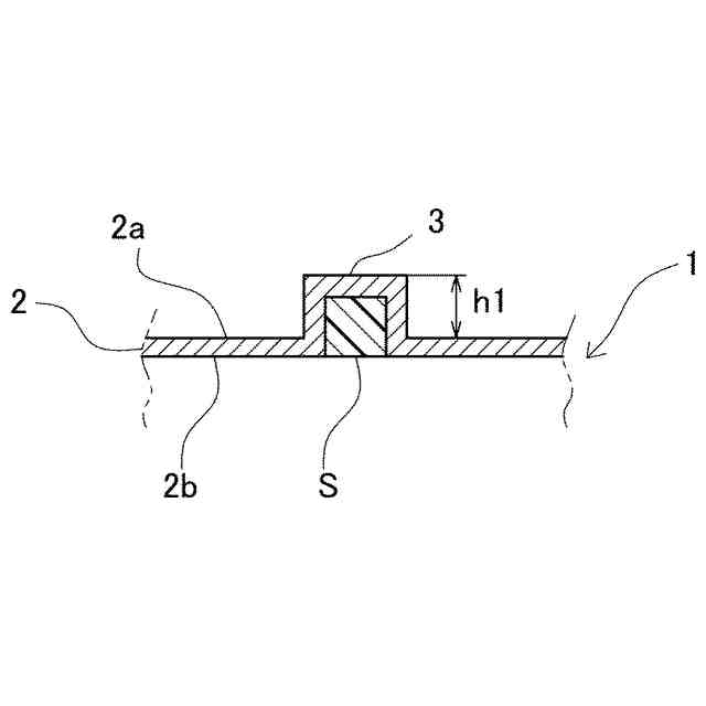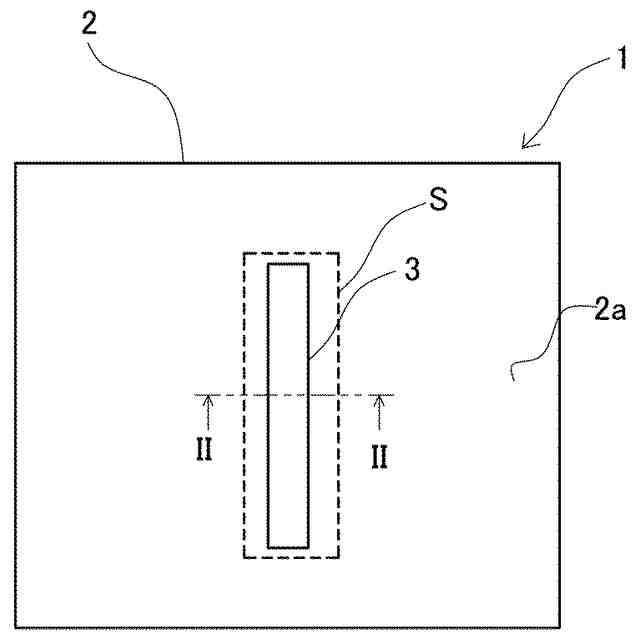 図1は、本実施形態の衣料1を模式的に示した平面図である。衣料1は、布製の生地本体2から構成されている。図1は、生地本体2の表面2a側を示している。生地本体2には、表面2a側において一方向に延びており、流体の流れを制御する、凸部3が設けられている。ここで、本明細書における流体とは、例えば気体又は液体を指す。凸部3は、生地本体2と一体となって形成されている。さらに、生地本体2の裏面2b側には、塗布剤Sが凸部3に沿って設けられている(図1の点線を参照)。