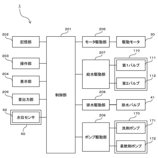 【解決手段】ドラム式洗濯機1において、水位検出部60は、外槽の底部に接続されたエアートラップと、外槽内の水位に応じて変化するエアートラップ内の空気圧を検出し、外槽内の水位に応じた値の水位信号を制御部201に出力する水位センサ62と、エアートラップと水位センサ62とを繋ぐホースと、を含む。制御部201は、異常検出処理において、ドラムを回転させて、当該ドラムの回転中に水位センサ62から水位信号を取得し、ドラムの回転前に水位センサ62から取得した水位信号に対するドラムの回転中に取得した水位信号の変動値が閾値よりも小さい場合に、水位検出部60に異常が生じたと判定し、水位検出部60の異常を知らせる報知を表示部204に行わせる。