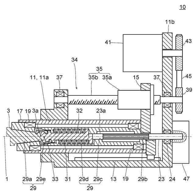 工具を装着するとき、自動工具交換装置や作業者が、工具を主軸穴に挿入する。次いで、送り装置は、送り台を主軸の先端方向に移動させる。すると、移動開始直後に、コレットが工具を保持する。続いて、主軸に対して相対的に主軸の基端方向に、ドローバーが移動する。すると、主軸の基端方向に向かう弾性体の弾性力が、ドローバーに徐々に加わる。そして、ドローバーは、コレットを介して工具を主軸に固定する。