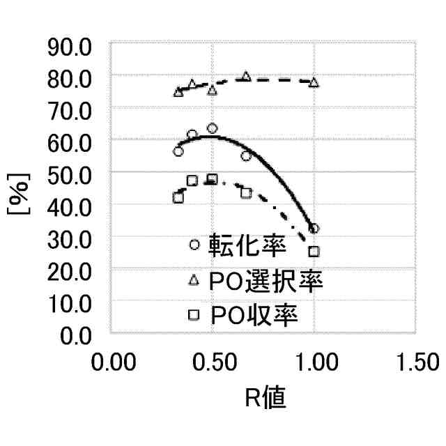 図3は、触媒のR値と、1,2-プロパンジオール転化率、プロピレンオキサイド選択率、プロピレンオキサイド収率との関係を表すグラフである。