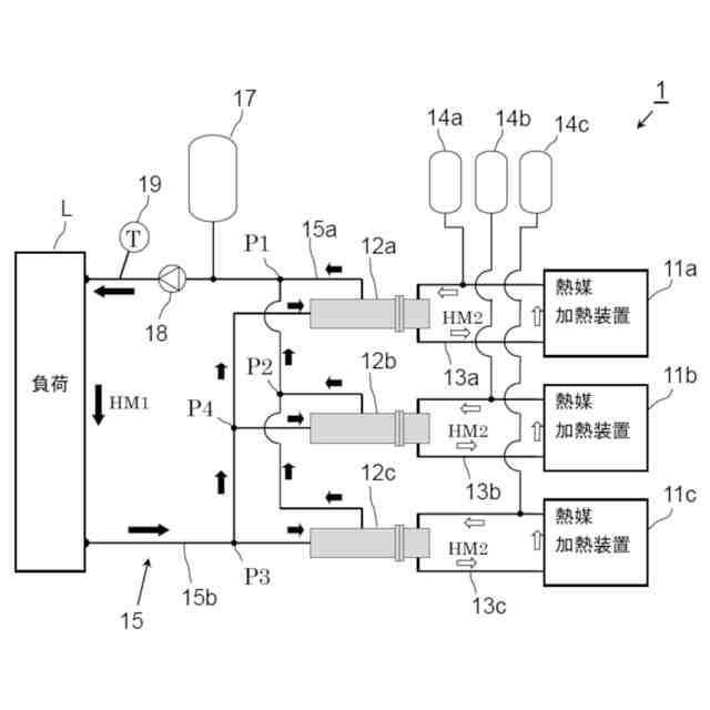 従来、熱媒加熱装置により加熱した熱媒(熱媒体)を負荷へ供給する熱媒供給システムが提案されている。一般的にこのような熱媒供給システムは、負荷と熱媒加熱装置を介在させるように熱媒の循環経路が形成され、熱媒加熱装置で加熱した熱媒を負荷へ供給するとともに、負荷で使用済みの熱媒を熱媒加熱装置に戻して再度加熱する。