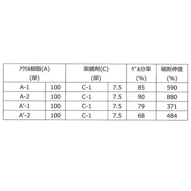 条件:アクリル系樹脂(A)及び架橋剤(C)からなる組成物を基材に塗布・乾燥し、ゲル分率65質量%以上に調整した試験片(幅15mm×厚み200μm)をチャック間距離20mmで300mm/minの速度で引っ張る