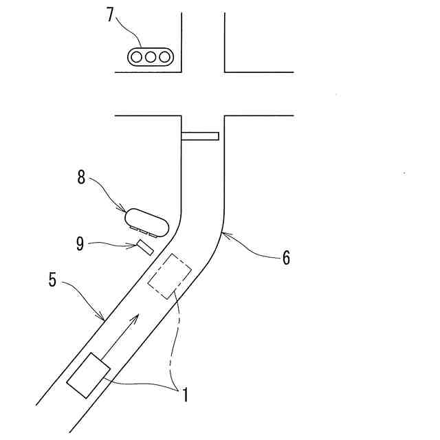 また、特許文献1の図9および段落0032-0033には、「本実施形態における車両30は、予告信号灯である信号機69の手前位置(車両34の位置)では停車せず、本来の信号機68の手前の正しい停車位置(車両36の位置)に停車できる」ということが記載されている。