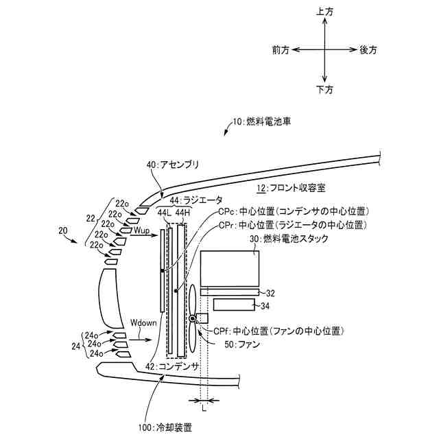 【解決手段】燃料電池スタック30を搭載した燃料電池車10の、冷却装置100は、(a)燃料電池車10の前方から後方に向けて順に、フロント収容室12内にコンデンサ42、ラジエータ44、ファン50が配置され、(b)燃料電池車10の前方から後方に見て、コンデンサ42はラジエータ44に比較して面積が小さく、(c)燃料電池車10の前方から後方に見て、ラジエータ44がコンデンサ42の中心位置CPcを含むように配置され且つコンデンサ42の中心位置CPcがラジエータ44の中心位置CPrに対して燃料電池車10の上方にずれて配置されている。