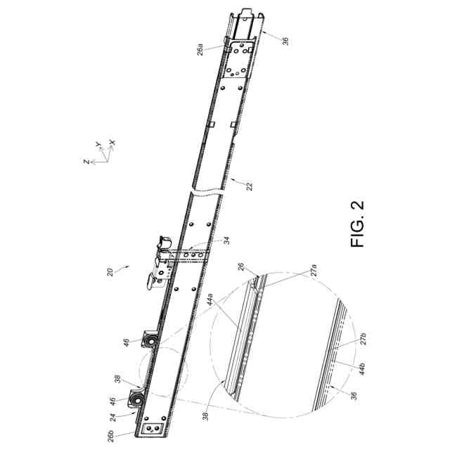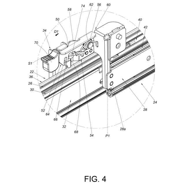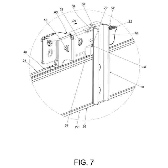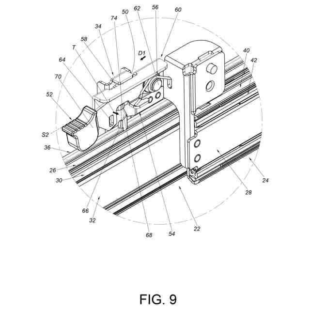前記可動レールが、前記所定位置から離れるように前記所定方向に移動される前記プロセスの間に、前記ロック部材を前記所定コンポーネントから係合解除するために、前記第1レールの前記支持フレームは、前記所定コンポーネントの前記ガイド構造に突き当たって前記所定コンポーネントをたわませるように構成され、