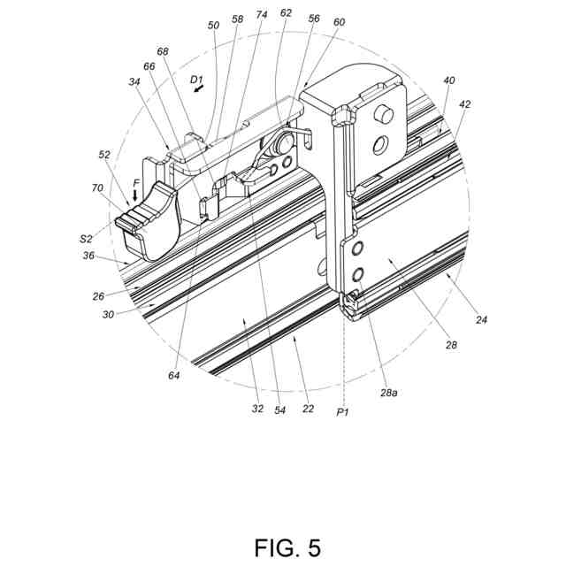 前記可動レールが、前記後退位置から離れるように前記所定方向に移動される前記プロセスの間に、前記ロック部材を前記所定コンポーネントから係合解除するために、前記第1レールの前記支持フレームは、前記所定コンポーネントの前記ガイド構造に突き当たって前記所定コンポーネントをたわませるように構成され、
