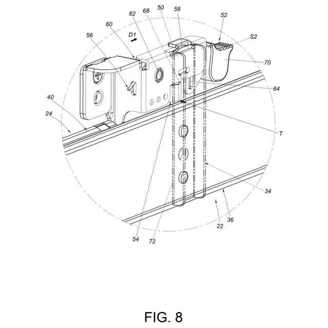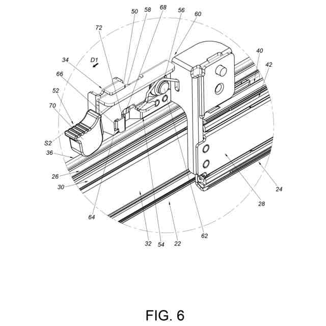 前記ロック部材がロック解除状態にある場合に、前記可動レールが、前記後退位置から離れるように前記所定方向に移動されることを可能にするために、前記ロック部材は、前記ブロッキング特徴部によってブロッキングされず、前記ロック部材を前記ロック解除状態に保持するために、前記ロック部材は、前記所定コンポーネントと係合するように構成されている、