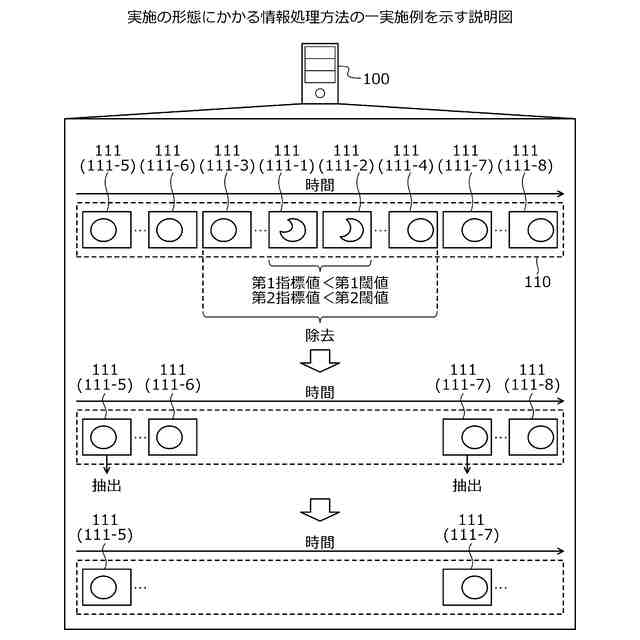 【解決手段】情報処理装置100は、経時的に連続する2つのフレーム111のペアごとに、当該ペアの2つのフレーム111のそれぞれから特定した物体が映った領域同士の重なり度合いを表す第1指標値を算出する。情報処理装置100は、継時的に連続する2つのフレーム111のペアごとに、当該ペアの2つのフレーム111のそれぞれにおける所定の種類の特徴量同士の類似度合いを表す第2指標値を算出する。情報処理装置100は、一連のフレーム111から、少なくとも第1指標値が第1閾値未満または第2指標が第2閾値未満であるペアの前後一定の数分のフレーム111を除去し、残余のフレーム111を特定する。情報処理装置100は、残余のフレーム111のうち他のフレーム111との所定の種類の特徴量の類似度合いが所定の条件を満たすフレーム111を抽出する。