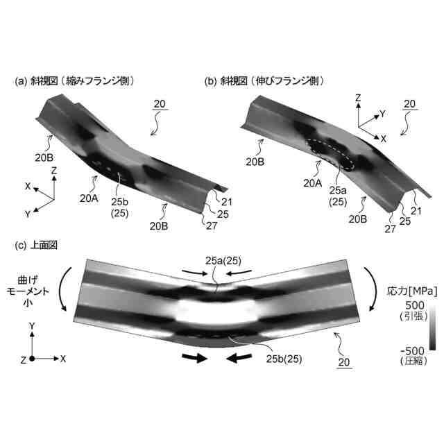 車体部品を統合一体化して部品点数を減少することによるコスト低減効果は大きいことから、従来よりもはるかに長尺な車体部品を製造することができるプレス成形技術が望まれている。しかしながら、図6に示すような、上面視において長手方向に沿って湾曲した湾曲部20Aと、湾曲部20Aの両端から直線状に延出する直線部20Bと、を有するハット断面形状のプレス成形品20においては、図7に示すように、壁開きやねじれのスプリングバックだけでなく、湾曲部20Aの曲がり角度が増加するスプリングバック(上面視キャンバーバック)が生じる。なお、図7において、白抜き矢印は、プレス成形品20の各位置におけるスプリングバックによる変位方向を示している。
