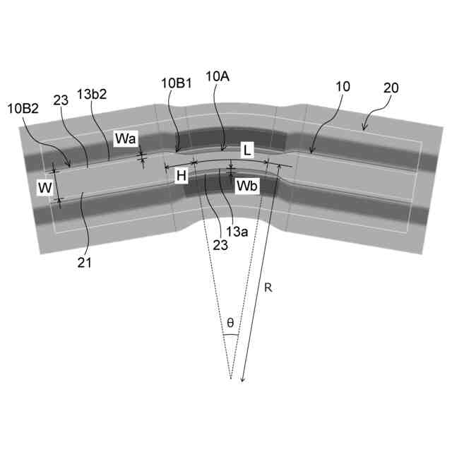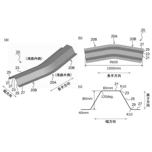 そこで、図6に示すような、上面視において長手方向に沿って湾曲した湾曲部20Aを有するプレス成形品20についても、特許文献1、3及び4の技術により、2工程でプレス成形することでスプリングバックを抑制することが可能ではないかと考えられた。しかしながら、1工程目でプレス成形した中間成形品に上面視キャンバーバックが発生すると、長手方向の位置によって水平方向の変形量が異なるため、2工程目で用いるプレス金型に中間成形品を嵌めることができず、プレス成形品20をプレス成形することができない場合があった。