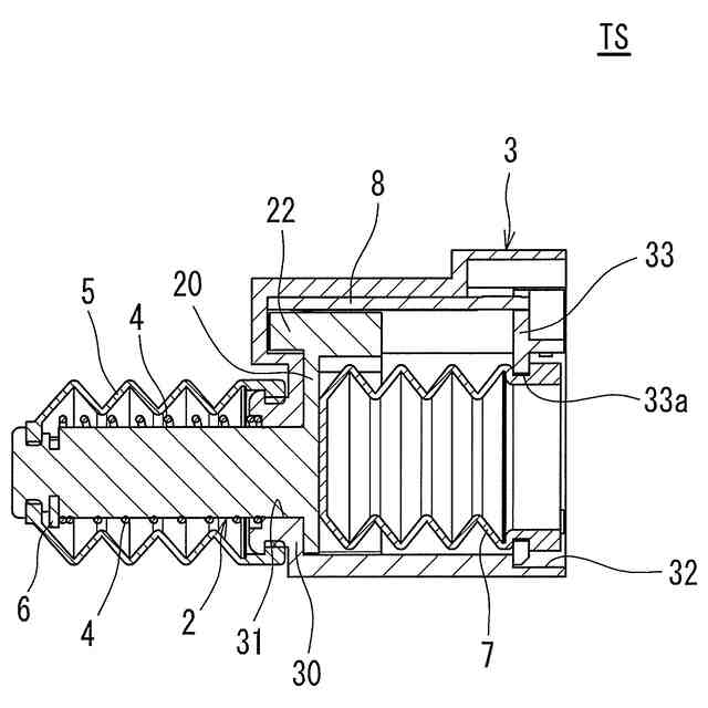 電動工具の操作用として、操作者の押込操作を受け付けるトリガキャップと、一端側にトリガキャップが取り付けられた軸部材(プランジャ)と、軸部材の他端側を収容する筐体とを備えたトリガスイッチが用いられている。筐体内には、回路を開閉する接点部材等が収容されているため、筐体には、防水及び防塵を目的とした気密性が要求される。