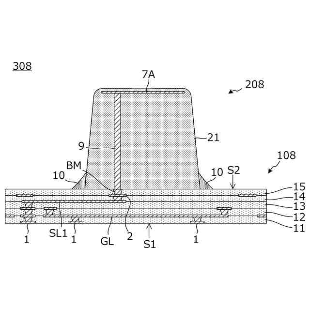 しかし、異種材料同士の接合であれば、多層基板と搭載部品との密着性の確保が難しい。また、多層基板とこの多層基板に搭載された搭載部品とでリジッド部が構成され、それ以外の多層基板単体部分はフレキシブル部であるので、このフレキシブル部を変形させることができるが、それとともにリジッド部も変形するおそれがある。また、フレキシブル部とリジッド部との境界(リジッド部の根元部)に応力が集中しやすいので、例えばフレキシブル部の湾曲により、上記境界でクラックが生じやすい。