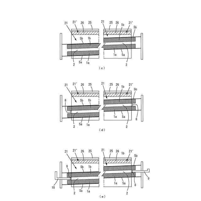 本実施形態による橋梁の桁端止水工法において、上側のバルーンの設置(同図(c))、端部蓋の設置(同図(d))、材料投入管及び空気吸引管の設置(同図(e))までの工程を説明するための工程図である。