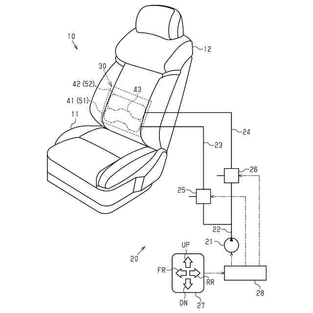 図1に示すように、シート10は、シートクッション11と、シートバック12と、空気圧システム20と、を備える。シート10は、例えば、車両の運転席、助手席及び後部座席などに採用される車両用シートである。他の実施形態において、シート10は、施設などで利用されるマッサージシートであってもよい。シートクッション11は、主にシート10に着座するユーザの臀部及び大腿部を支える部分である。シートバック12は、主にシート10に着座するユーザの腰部及び背中を支える部分である。