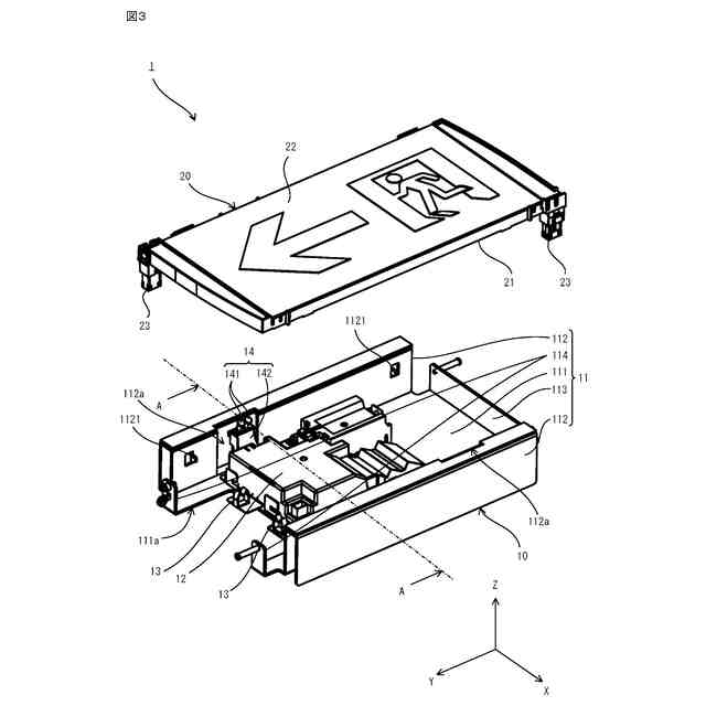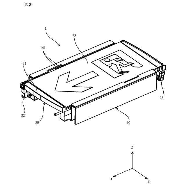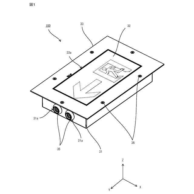 図1に示すように、表示装置100は、扁平な箱状の収納ケース31と、矩形板状であり中央部に平面視矩形状の開口部33aを有し収納ケース31の+Z方向側の開放部分の内周部全体を覆うように配置された枠体33と、透光性を有する材料から矩形板状に形成され枠体33の内側において装置本体1の+Z方向側を覆うように配置された保護カバー32と、を備える。収納ケース31の内側には、図2に示す装置本体1が収納されている。また、図1に示すように、収納ケース31の周壁には、2つの開口部31aが貫設されており、装置本体1から導出されるワイヤハーネス(図示せず)が当該2つの開口部31aそれぞれに装着されたブッシング35に挿通される。枠体33は、金属、樹脂等から形成され螺子36により床、廊下等に固定されている。