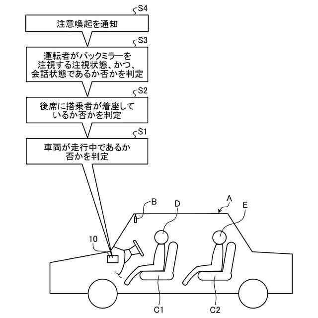 本発明にあっては、車両の後席に搭乗者が着座している状態で、運転者がバックミラーを注視する注視状態であり、かつ、運転者が会話状態である場合、運転者がバックミラーで後席の搭乗者を見ながら会話していると推定し、注意喚起を通知するようにした。これにより、本発明は、運転者がバックミラーで後席の搭乗者を見ながら会話していることを検知して、注意喚起を通知することができる。