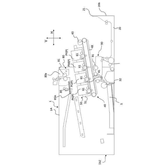実施例1のドアおよび二次転写ユニットを開いた状態のプリンタを示す図