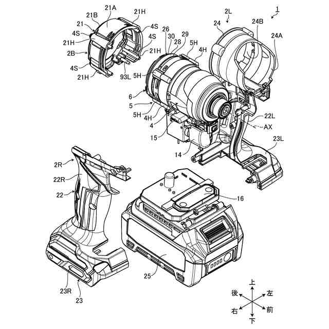 電動工具の組立時には、前後分割のハウジングによって、モータ、減速機、ハンマーユニットなどの回転機構を回転軸に沿って積み上げるように組み立てることが可能である。一方、前後分割のハウジングでは、ハンドル部のスイッチや配線の組付けが煩雑で、作業性が低くなる。
