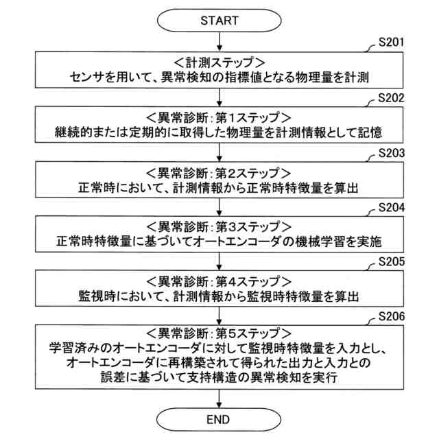 【解決手段】道路構造物に配置されたセンサにより物理量を計測するステップと、計測結果から算出した特徴量に基づいて支持構造の異常を検知する異常診断ステップとを備え、異常診断ステップは、物理量を記憶させる第1ステップと、正常時において正常時特徴量を算出する第2ステップと、正常時特徴量をエンコーダ層への入力として、デコーダ層に同一の出力が再構成されるようにオートエンコーダの学習を実施する第3ステップと、監視時において監視時特徴量を算出する第4ステップと、学習済みのオートエンコーダに対して監視時特徴量を入力として再構成されたデータを出力とし、入力と出力の誤差に基づいて支持構造の異常検知を実行する第5ステップとを有する。