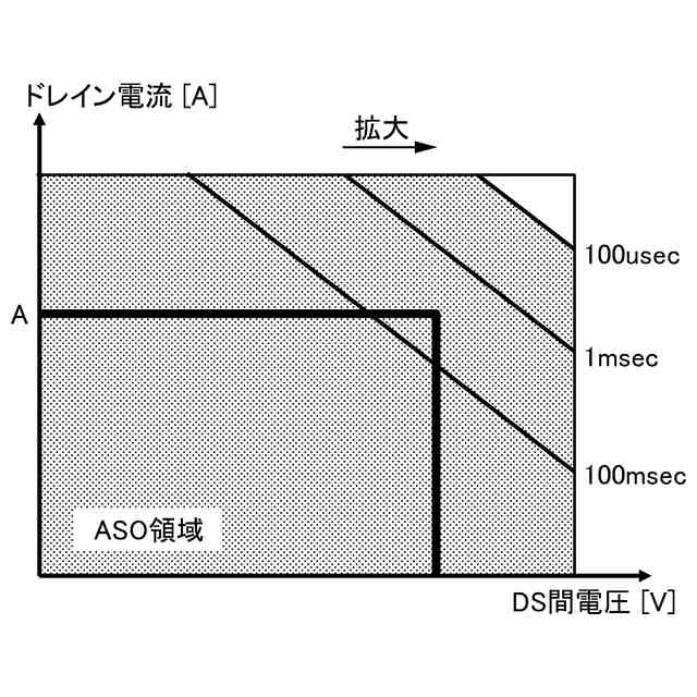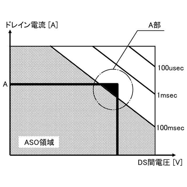 図2は、FETQ20のスイッチング時間TSと熱損失Wの関係を示している。スイッチング時間TSが長いと、熱損失(スイッチングロス)Wが大きくなる。その結果、図3AのA部に示すようにASO領域(安全動作領域:Area of Safety Operation)を逸脱し、FET故障に繋がる可能性がある。FETQ20の故障を回避するには、FETQ20の並列数を増やして、1つ当たりのドレイン電流を下げ、ASO領域から逸脱しないようにすることが考えられる。