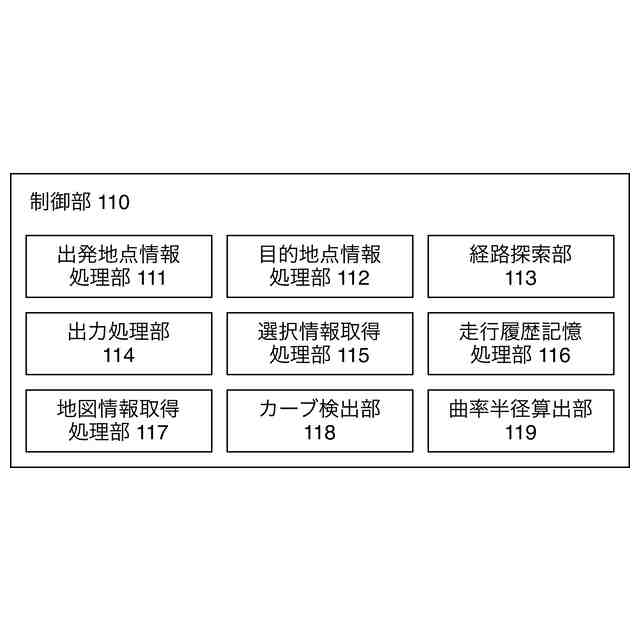 上記課題を解決するために、請求項1に記載の発明は、出発地点に関する情報を取得する出発地点情報取得処理部と、目的地点に関する情報を取得する目的地点情報取得処理部と、前記出発地点から前記目的地点までの経路を探索する経路探索部と、を有し、前記経路探索部は、曲率半径の値が第1の曲率半径値より小さい所定のカーブを含む第1の経路、および前記所定のカーブを含まない第2の経路の少なくともいずれか一方を探索する。