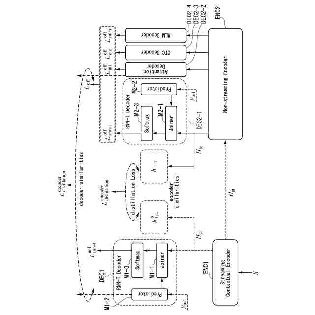 (2)本発明の第2の例は、第1の例において、前記学習部は、前記第1特徴列が前記第2特徴列に類似するように、前記ストリーミングエンコーダと前記ノンストリーミングエンコーダとの間で前記知識蒸留を行うものである。