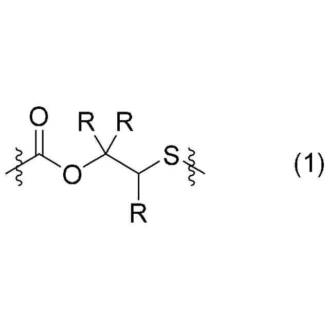 また、特許文献3には、下記一般式(1)で表す部分構造を備えた高分子化合物が開示されている。この高分子化合物には、一般式(1)に示すようにスルフィド(硫黄原子)が存在する。そして、そのスルフィドのβ位となる炭素原子に、安定なアニオンを形成して脱離基となり得るカルボニルオキシ基が結合しており、このスルフィドを酸化剤で酸化させた後で塩基を作用させると、下記化学反応式にて(A)~(D)又は(A’)~(D’)で示すように、塩基の作用によりカルボニルオキシ基がアニオンとなって上記β炭素から脱離して、ポリマー鎖が切断される。