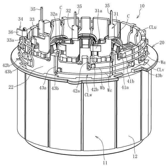 この環状部に、複数のU相コイルが間隔を空けて形成された一本の連続したU相コイル線の渡り線部、複数のV相コイルが間隔を空けて形成された一本の連続したV相コイル線の渡り線部、及び複数のW相コイルが間隔を空けて形成された一本の連続したW相コイル線の渡り線部を、軸方向に間隔を空けて保持した渡り線保持部が設けられていることを特徴とする。