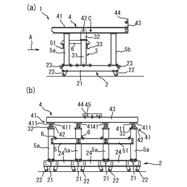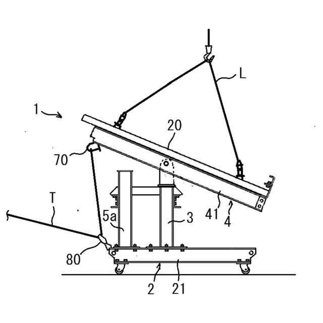 建築現場においては、1tを超えるような板状の運搬物を運搬台車に積み込んで建物内の通路や乗用エレベータのような狭隘な空間で運搬した後、荷降ろしを行うことが求められる。これら一連の作業を容易に行うためには、荷台の傾斜角度をそれぞれの作業に合わせて可変とすることが望ましい。
