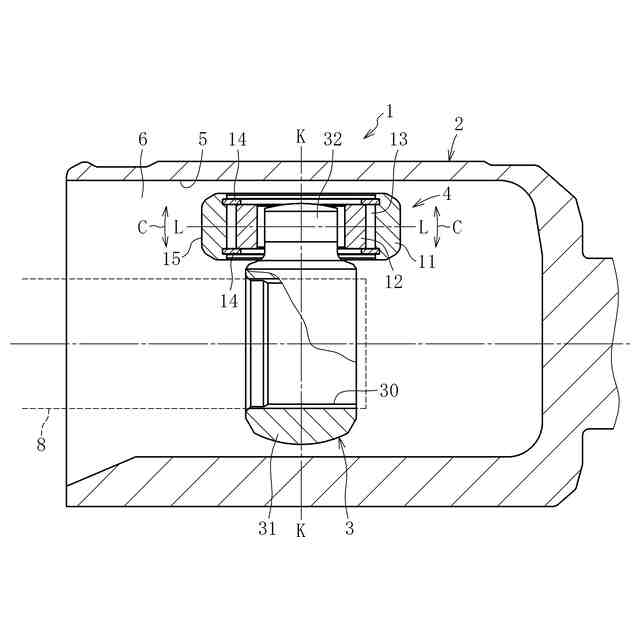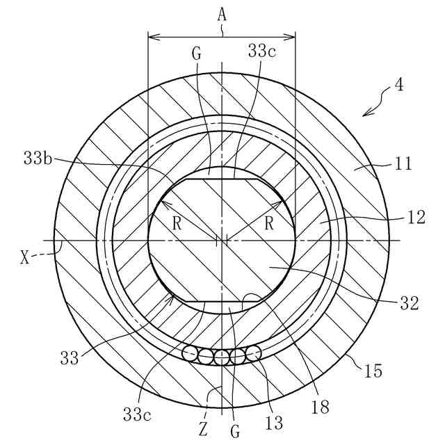 図11に示すトリポード型等速自在継手を組み立てる際には、トリポード部材102の脚軸104を、インナリング110の内周に圧入して環状突起115を乗り越えさせる必要がある。この種のトリポード型等速自在継手では、トリポード部材102の脚軸104の球状外周面の横断面形状(円)が、インナリング110の内周面の横断面形状(円)と略一致している。この場合、インナリング110の内周に脚軸104を圧入する際に、脚軸104の球状外周面とインナリング110の環状突起115とが全周で干渉するため、大きな圧入荷重が必要となり、組立性が低下する。
