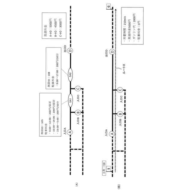 高速道路や自動車専用道路など(以下、「有料道路」とも呼ぶ。)のサービスエリア(SA)やパーキングエリア(PA)などの施設において駐車料金を課金することが検討されている。この場合、有料道路の通行料金に加えて、有料道路の駐車施設での駐車料金を考慮して目的地までの経路を検討する必要がでてくる。その一方で、トラック運転者などに関しては、法令により労働時間に関する基準が設けられている。よって、法令順守の観点から、これらの基準に適合した経路を提案することが求められる。