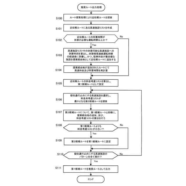 また、請求項に記載の発明は、プログラムであって、出発地及び目的地を取得し、前記出発地から前記目的地に至る経路であって、有料道路における駐車施設での駐車時間が希望滞在時間より長く、かつ、車両の連続運転時間が希望連続運転時間以下となる複数の経路を探索し、前記複数の経路について、前記目的地までの所要時間又は距離、前記有料道路の通行料金、及び前記駐車施設の駐車料金、のそれぞれについてのコストを含む総コストを計算し、前記総コストが最も小さい経路を含む1又は複数の経路を、推奨経路として出力する処理をコンピュータにより実行させる。