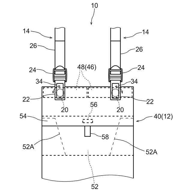 また、ストラップはスナップボタンにより基端において本体部に着脱自在、かつ、回転可能に取付けられてもよい。ストラップがスナップボタンにより本体部に着脱自在であれば、例えば予め一対のストラップの先端側を連結し利用者の首やウェストに回してからストラップの基端を本体部に取付けることができる。また、予め各ストラップを車椅子のアームレストやパイプ、安全ベルト等に取付けてからストラップの基端を本体部に取付けることもできる。このようにストラップの取付け方のバリエーションが増えるのでストラップの取付けの容易化に寄与する。また、スナップボタンは着脱自在の機能に加え回転機能も兼ね備えるので構成のシンプル化にも寄与する。