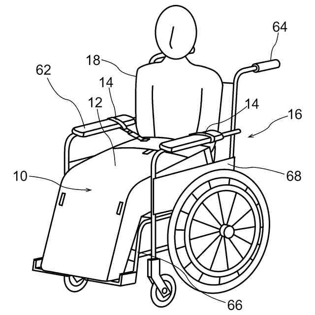 車椅子の利用者のための様々なタイプのレインウェアや防寒着が市販されている。その一つとして膝掛けが知られている。なお、膝掛けがボトムスとして着用され、トップスとしてマント、ポンチョ、コート等が着用されることがある。膝掛けはシンプルな形態で下肢の上に載せるだけで容易に着用できる一方、風でずれたり捲れたりしやすい。このためストラップ等を介して膝掛けが車椅子や利用者に取付けられることがある。