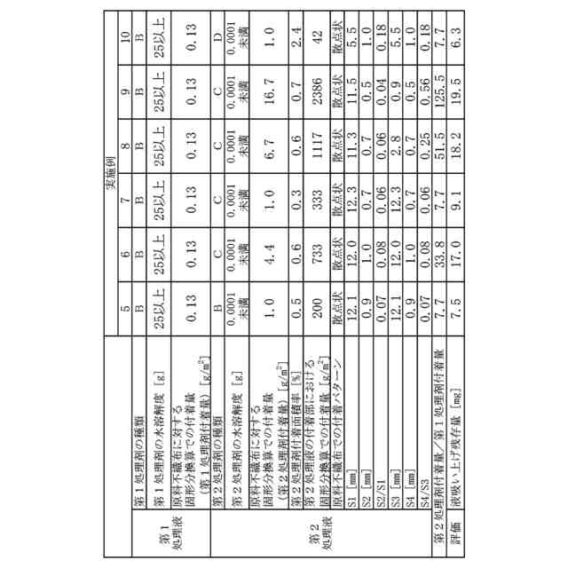 特許文献1及び2には、液膜開裂剤を用いた吸収性物品用不織布として、不織布の表面に、液膜開裂剤(化合物C1、C2)を含む含有部と、これを含まない非含有部とを有するものが記載されている。特許文献1及び2には、液膜開裂剤の水溶解度は0g以上0.025g以下が好ましいこと(特許文献1の請求項10、特許文献2の請求項11)、液膜開裂剤を繊維の表面に付着させる方法としてフレキソ印刷及びインクジェット印刷等が利用できること(特許文献1の[0017]及び[0162]、特許文献2の[0015]及び[0152])、液膜開裂剤は、不織布の構成繊維の表面全体に均等に付着させるよりも、繊維交絡点付近に局在させる方が好ましいこと(特許文献1の[0118]、特許文献2の[0102])等が記載されている。特許文献1及び2に記載の不織布によれば、不織布の繊維間にできる液膜を低減してより高いレベルでの液残り低減を実現しつつ、不織布の表面における液流れを防止できるとされている。