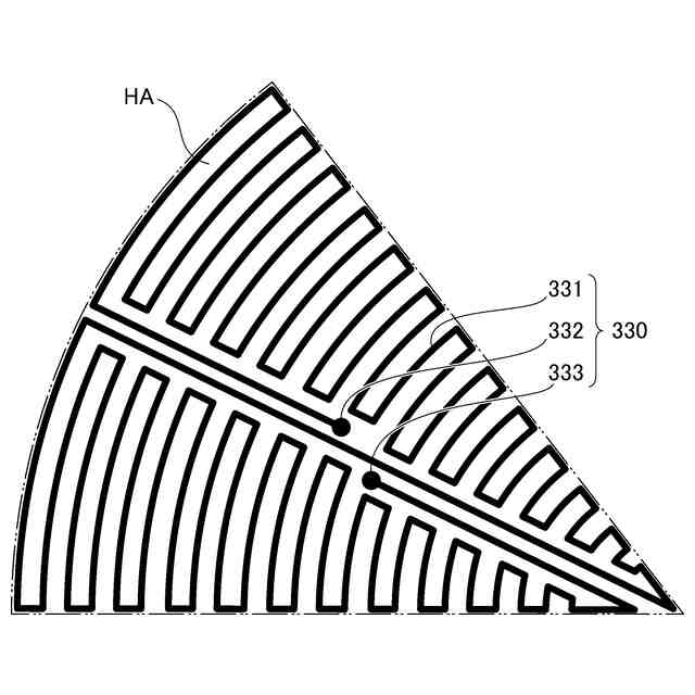 ヒーターのうち、上記第2部分の根元の部分は、発熱部が引き回されていないため非発熱部部分となる。また、上記領域の境界の部分も同様に、発熱部が引き回されていないため非発熱部部分となる。