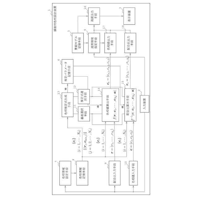 【解決手段】実測された各原料の色相値、並びに各標本配合比により各原料を配合して作られる舗装材の実測された色相値を記憶する色相情報記憶手段と、設計する舗装材の各原料の配合比を入力する配合比入力手段と、色相情報記憶手段に記憶された各原料の色相値、並びに各原料の各標本配合比により作られる舗装材の色相値に基づき、各原料の任意の配合比により作られる舗装材の色相値を推定する色相推定式を生成する色相推定式生成手段と、色相推定式に基づき、配合比入力手段により入力される各原料の配合比により作られる色相値を算出する色相値算出手段と、色相算出手段により算出される色相値を、表示装置に出力する色相出力手段とを備えた。