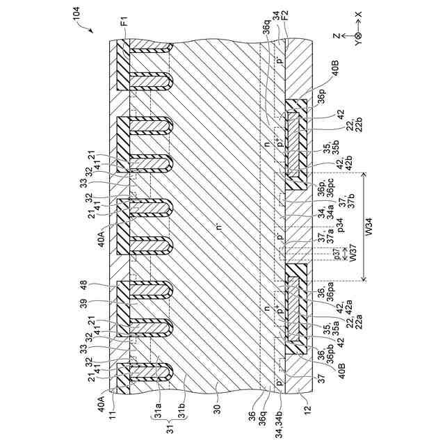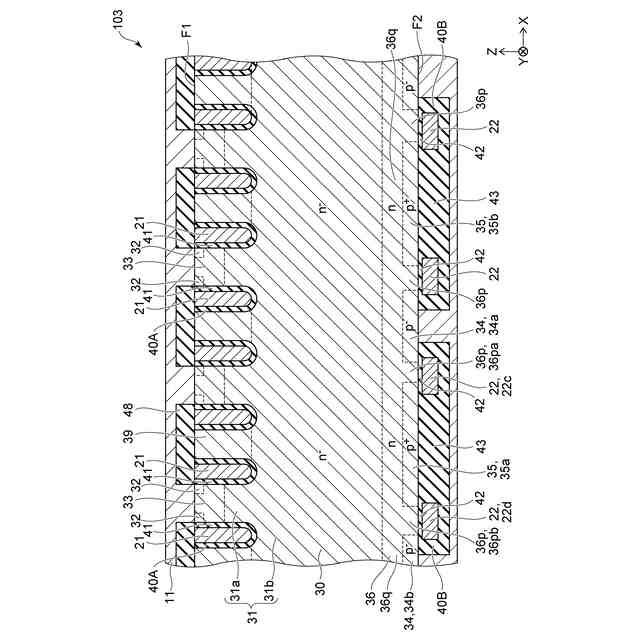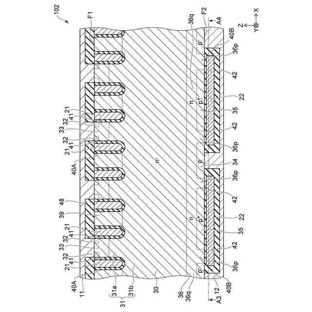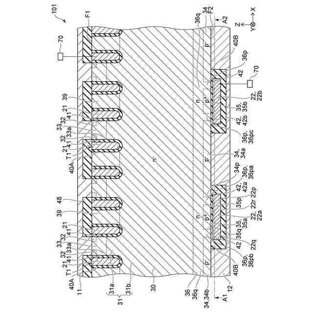 図2は、図1に示したA1-A2線における断面を例示している。図2においては、半導体層30の裏面側の半導体領域の位置を破線で示している。また、それら半導体領域の不純物濃度(n、p