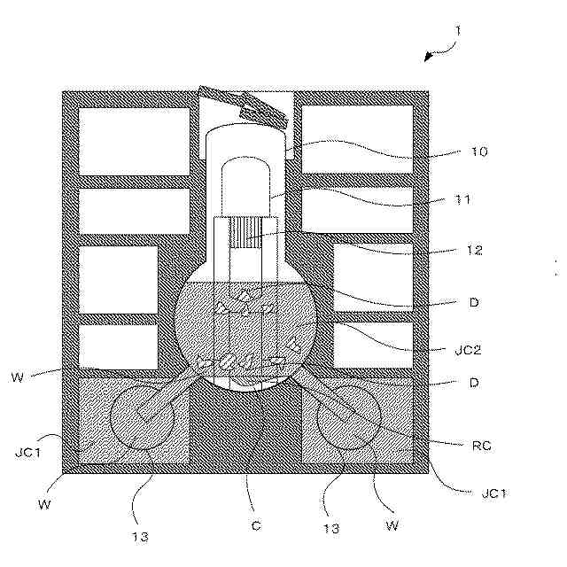 核燃料溶融事故が起きた場合、核燃料12の冷却が阻害され、高温になった核燃料12は核燃料の容器等とともに溶融して自重により落下し、冷えてデブリDが生成される。デブリDは、原子炉格納容器10の底部にも溶け落ちて固化することもある。