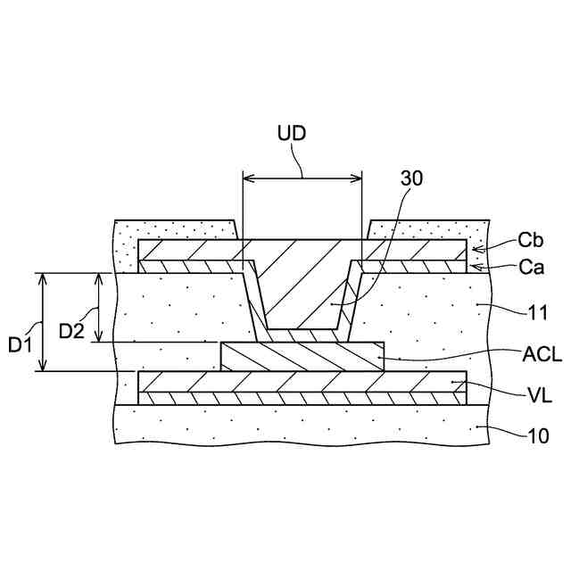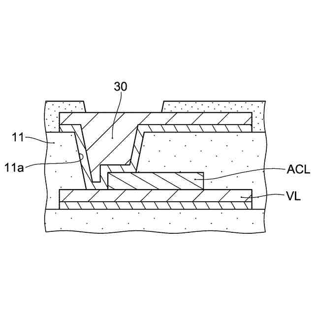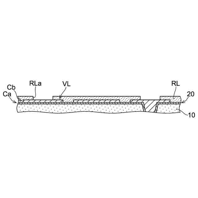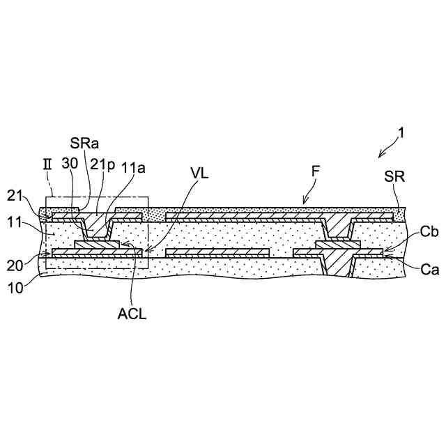 図1では、配線基板1が有し得る複数の絶縁層および導体層のうち、一方の面F側の、2層の絶縁層10、11、2層の導体層20、21、および、ソルダーレジスト層SRが示されている。導体層20と導体層21とは、絶縁層11を厚さ方向に貫通するビア導体30によって接続されている。配線基板1の一方の面Fを構成するソルダーレジスト層SRには、開口SRaが形成され、開口SRaからは、導体層21に含まれる導体パッド21pの表面が露出している。