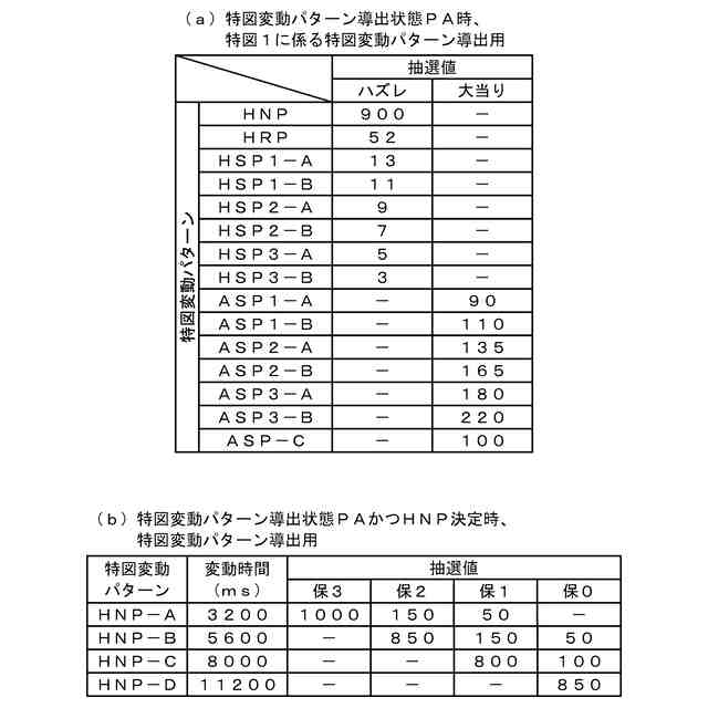 図9(a)は、特図変動パターン導出状態PA時の特図1に係る図柄変動で用いられる特図変動パターン抽選テーブルを模式的に示す図であり、図9(b)は、特図変動パターン導出状態PA時の特図1に係る図柄変動において特図変動パターンHNPが決定された場合に用いられる特図変動パターン抽選テーブルを模式的に示す図である。