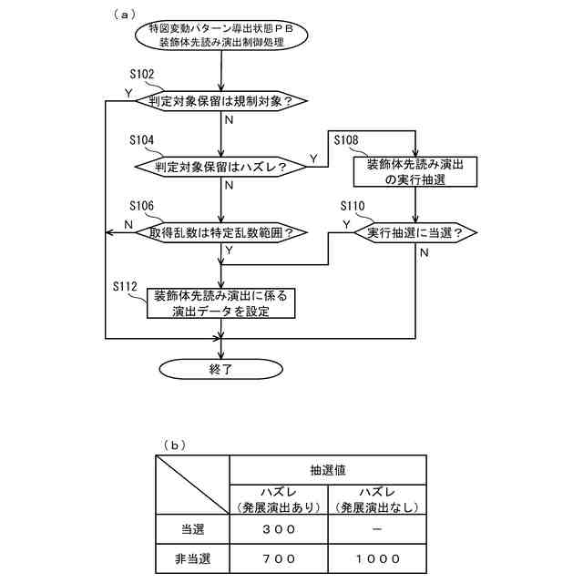 図13(a)は、特図変動パターン導出状態PB装飾体先読み演出制御処理のフローであり、図13(b)は、特図変動パターン導出状態PB装飾体先読み演出制御処理における装飾体先読み演出の実行抽選に用いられる抽選テーブルを模式的に示す図である。